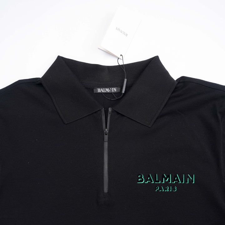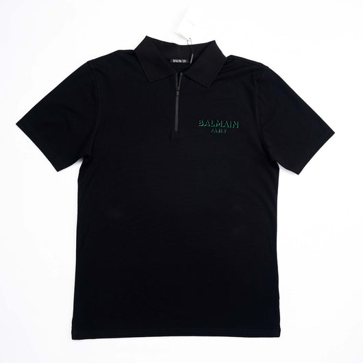 The Balmain Embroidered Signature Zipped Polo in black with green accents combines bold style with practical design. Featuring a convenient zipper and signature embroidery, this polo offers a modern twist on a classic look. Crafted for comfort and durability, it’s an excellent choice for those seeking a fashionable yet functional shirt.