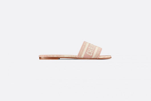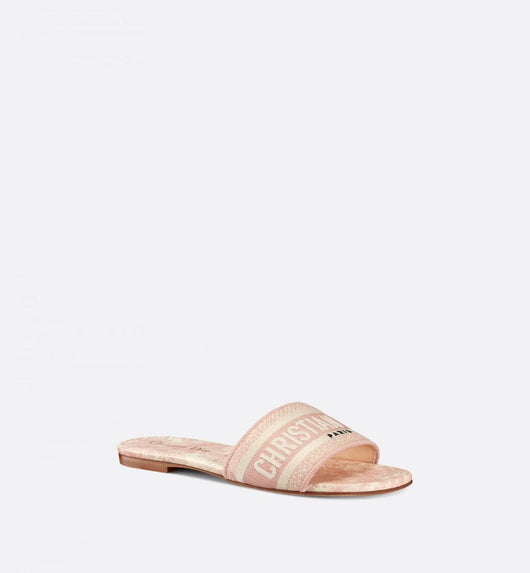Part of the Dioriviera capsule, the Dway slide is a hallmark and timeless style featuring the Toile de Jouy Sauvage motif. The begonia pink upper is embroidered with the Christian Dior Paris signature for an instantly recognizable touch, while the minimalist silhouette will slip on easily to complete a laid-back outfit. The shoe can be paired with other creations from the Dioriviera capsule.