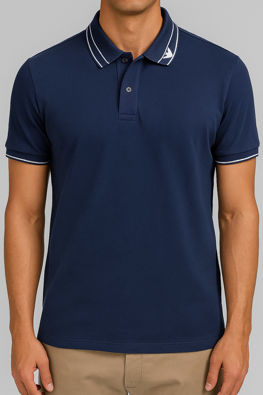 Elevate your everyday style with this classic navy polo shirt, designed with subtle white piping on the collar and sleeves for a refined finish. Crafted from a soft, breathable cotton-blend fabric, it features a ribbed collar, two-button placket, and tailored fit—making it the perfect choice for both casual outings and smart-casual occasions.
