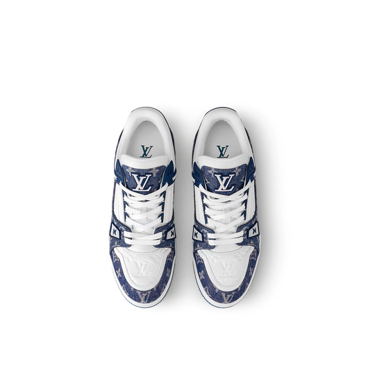 The iconic LV Trainer sneaker is revisited this season in a combination of Monogram denim and Monogram-embossed grained calf leather. The contrasting colors and materials highlight the elaborate construction of this model, which was inspired by vintage basketball sneakers.