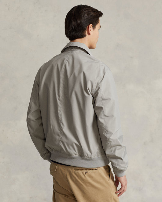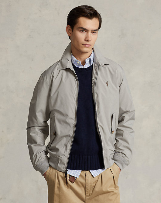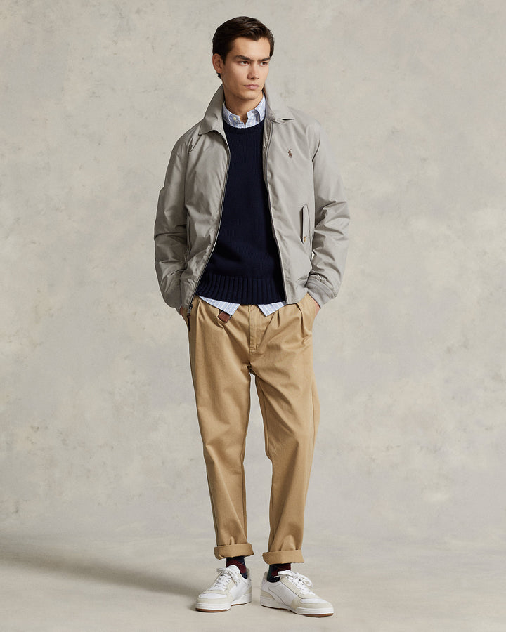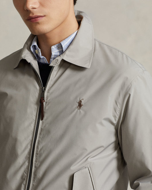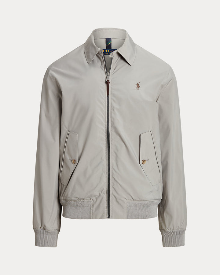 - Point collar. Buttoned throat tab. Full-zip front with a leather zip pull.