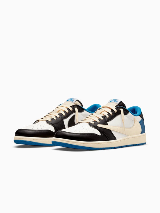 Their Air Jordan 1 Low colourway comes in familiar colour blocking schemes, but with special touches only Scott and Fujiwara could've conjured up. On top of an aged midsole with matching Sail laces, fresh Military Blue accents the heel, collar and insole, providing a new flavour for a classic make-up. And no need for double-takes at the Sail Swoosh—it's indeed backwards—now a signature Scott touch for his Air Jordan 1 designs.